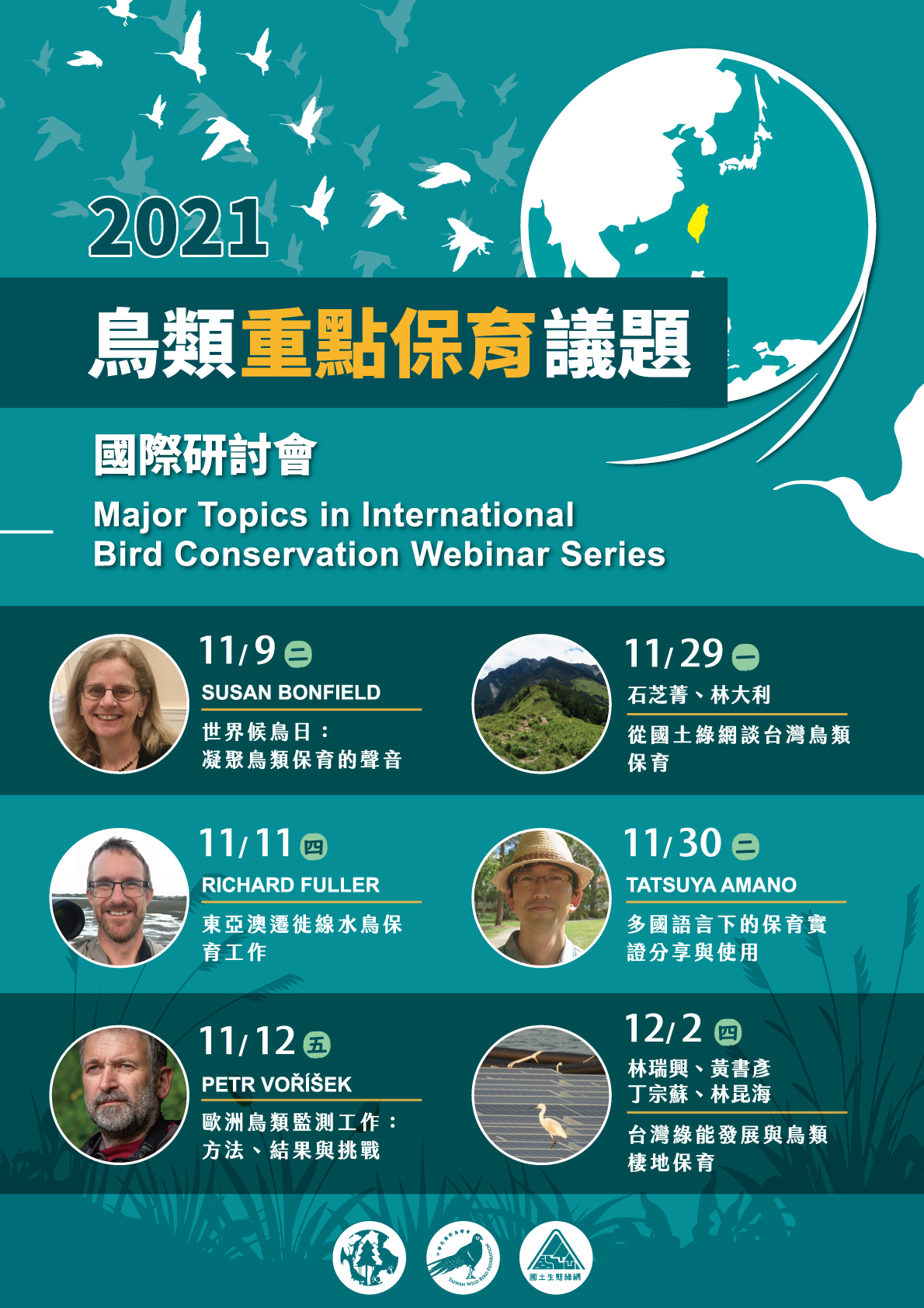 為拓展大眾的保育視野,本次研討會邀請4位國際鳥類保育工作者與學者來分享他們所投入的工作與研究,並邀請行政院農委會林務局與特有生物研究保育中心來談國土生態綠網計畫與臺灣國家鳥類報告。另綠能發展對於鳥類棲地影響是當前國內重要的保育課題,我們也邀請實際參與綠能議題的鳥類保育專家來談目前的現況與行動。期望透過研討會的專題分享及各位的意見交流,能夠讓我們更聚焦需要關注與投入的保育課題,歡迎所有關心鳥類保育的朋友一同共享盛舉!